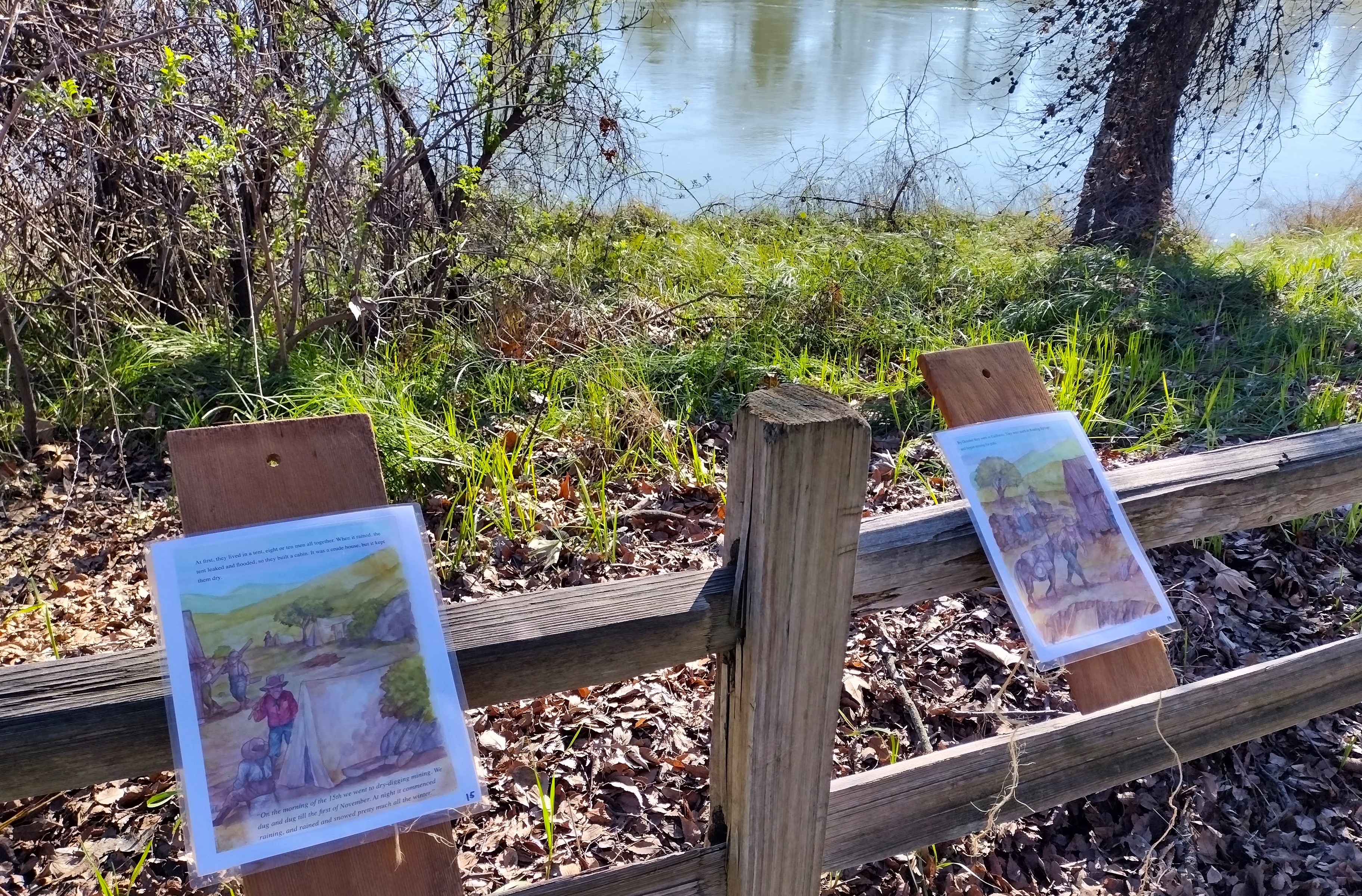 The guides at Ide Adobe do a StoryWalk every month, featuring a seasonal or fun picture book. Today’s book, in honor of Black History Month, was my book on Alvin Coffey, African-American Forty-Niner. The pages were cut apart, laminated, and posted on the fence along the river. Read at your own pace.