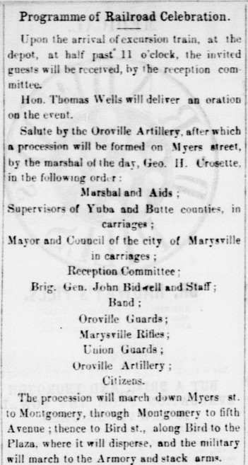 The event that got the most coverage was the completion of the California Northern Railroad, linking Marysville and Oroville. This was a boon to merchants and shipping, and called for a parade and speeches, followed by a collation, a ball, and general jubilation. All the local militia units would be on display.