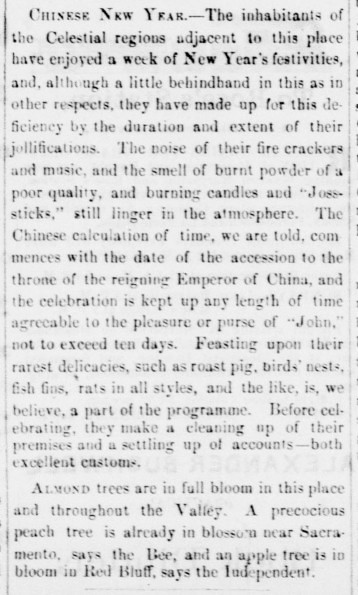 The newspaper also took note of the Chinese celebration of the Lunar New Year, referring as they often did, to the Chinese as “celestials.”