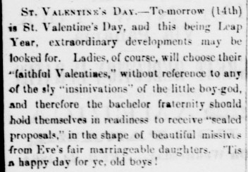 And of course, Valentine’s Day. 1864 was a year to be reckoned with — it was a leap year, when custom said that women could propose to men. “The bachelor fraternity should hold themselves in readiness”!