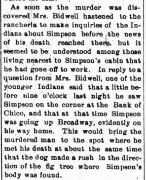 The murdered body of Billy Simpson was discovered early on the morning of February 28th. General and Mrs. Bidwell were already up and were notified immediately. Annie Bidwell quickly walked the few blocks to the Indian village.