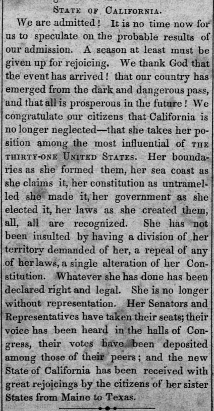 The citizens of California were well prepared to become a state. Never a territory, they had organized themselves in 1849 with a Constitutional Convention. They had passed a code of laws and elected two U.S. senators (William Gwin and John C. Fremont) who were ready to take their seats as soon as statehood became official. The newspapers trumpeted the glad tidings.