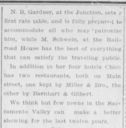 Up until 1860, the only option for accommodation was Bidwell’s adobe hotel/tavern/ranch headquarters on the north side of Chico Creek. But with a new town on the south side with houses, shops, and services, hotel rooms were soon available. In 1862 the first hotel, the Chico Hotel, was opened.