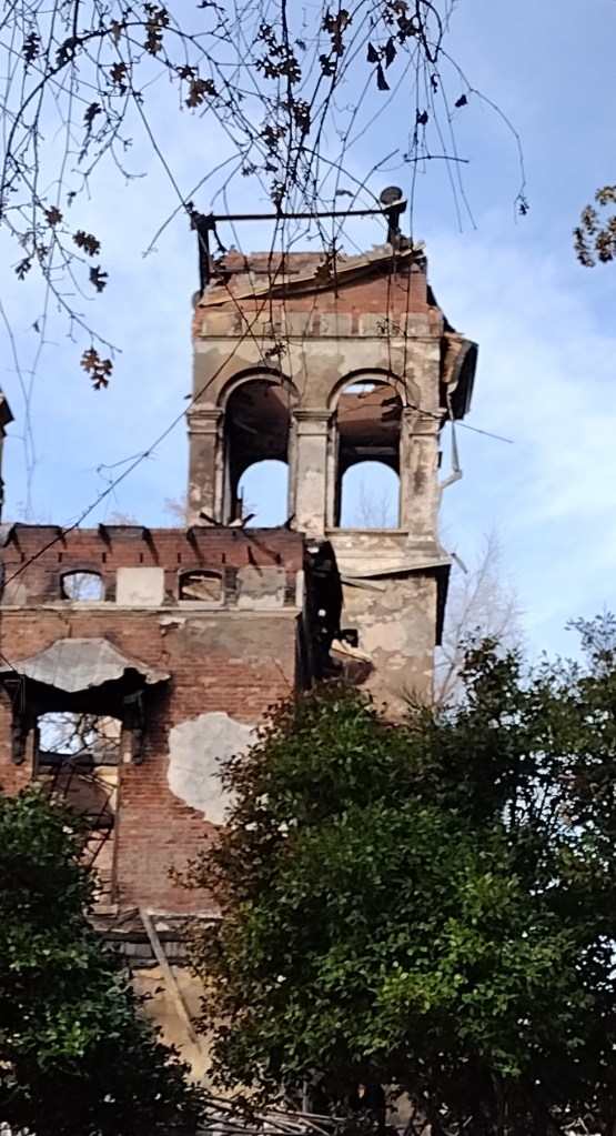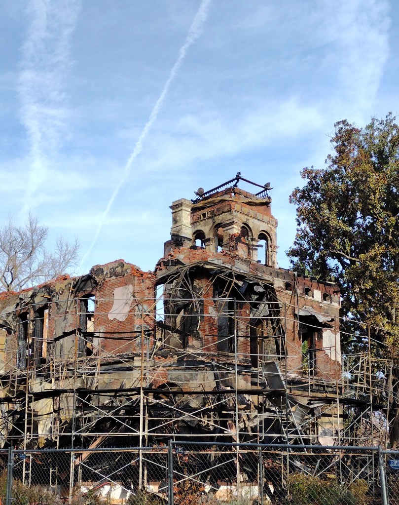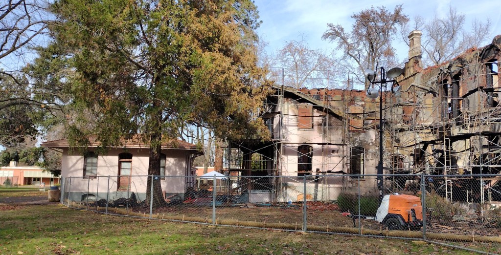 I walked through Children’s Park and across the footbridge on Wednesday to take a closer look at the destruction. It is a sad sight to see. Later that day State Parks held a press conference and announced that the fire that destroyed Bidwell Mansion in the early hours of December 11 was deliberately set. Here is their press release: