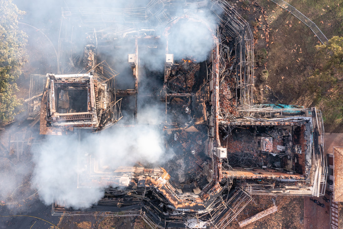This aerial photo, taken by Chico State photographer Matt Bates shortly after the fire, shows smoke and flames smouldering inside the shell of the Mansion. The tower, still standing, is on the left, the elongated octagon that formed the library and dining room in in the center, and the kitchen wing is on the right. It remains to be seen what, if anything, can be salvaged from the interior.