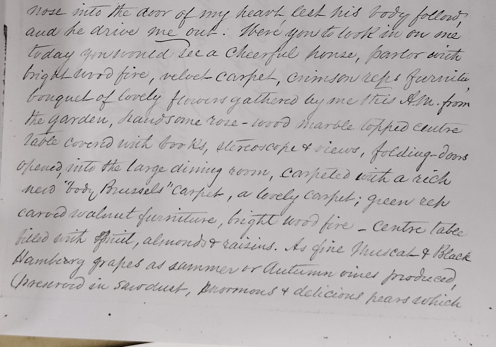 Were you to look in on me today you would see a cheerful house, parlor with bright wood fire, velvet carpet, crimson reps furniture, bouquet of lovely flowers gathered by me this A.M. from the garden, handsome rose-wood marble centre table covered with books, stereoscope & views, folding-doors open into the large dining room, carpeted with a rich new “body Brussels” carpet, a lovely carpet; green rep carved walnut furniture, bright wood fire – centre table filled with fruit, almonds & raisins. As fine Muscat & Black Hamburg grapes as summer or Autumn vines produced, preserved in sawdust, enormous & delicious pears which I daily wish Papa could enjoy together with the figs and apples.