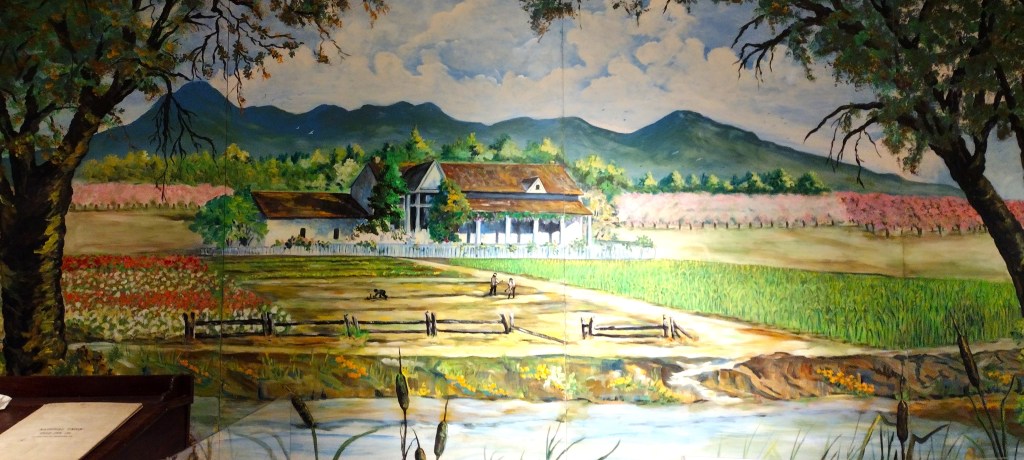 Since the county is named after John Sutter, there was a corner dedicated to him. His reputation is sliding downwards nowadays, but he was a significant historical figure and should be acknowledged. The mural on the wall shows a nice view of what Sutter’s Hock Farm would have looked like from the Feather River, with the Sutter Buttes in the background. (The house burned down in 1865.) There is also a painting of the Hock Farm in 1851, before the big house was built, by William Smith Jewett.