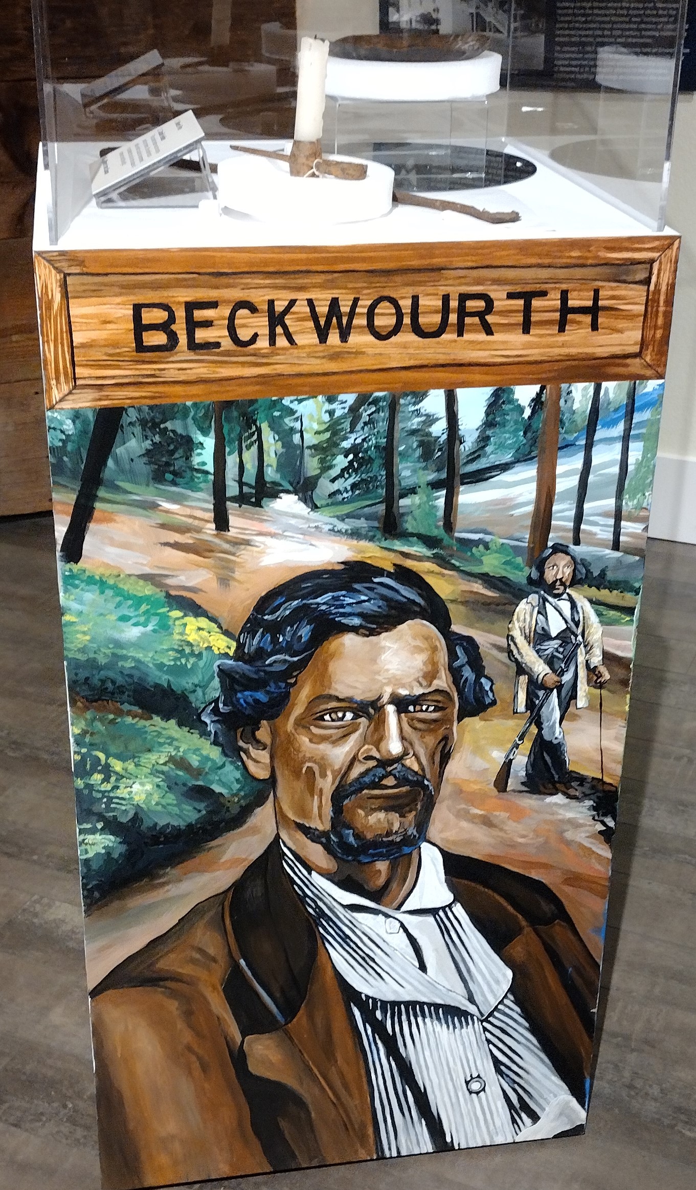 I particularly liked the area devoted to black and African American history, which included a shout-out to the Sweet Vengeance Mine. Some of the people highlighted here, like Jennie Carter and Edward Duplex, I have written about on this blog. But I have never written anything on Jim Beckwourth, and I really should. The painting on this display case, by local artist Louis Lethridge, is really striking.