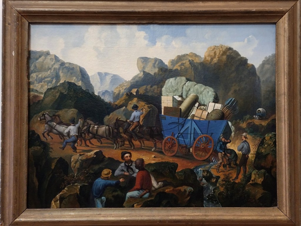 The three men relaxing in the foreground are watching two other men trying to lift a wheel caught in a stream, while the driver and his assistant urge the six mules forward. The over-loaded wagon is burdened with shovels, a keg of something undoubtedly alcoholic, and a variety of heavy boxes. It reminds me of the adventures of Ed McIlhaney, who had a mule-packing outfit (but no wagon) taking good to the mines. On one trip his first mule was loaded with “twenty gallons of whisky in two ten-gallon kegs each.” The other five mules were loaded with “250 pounds each of sugar, coffee, bacon, rice, and potatoes” and a few other items. His most memorable trip involved packing a billiard table to Rich Bar.