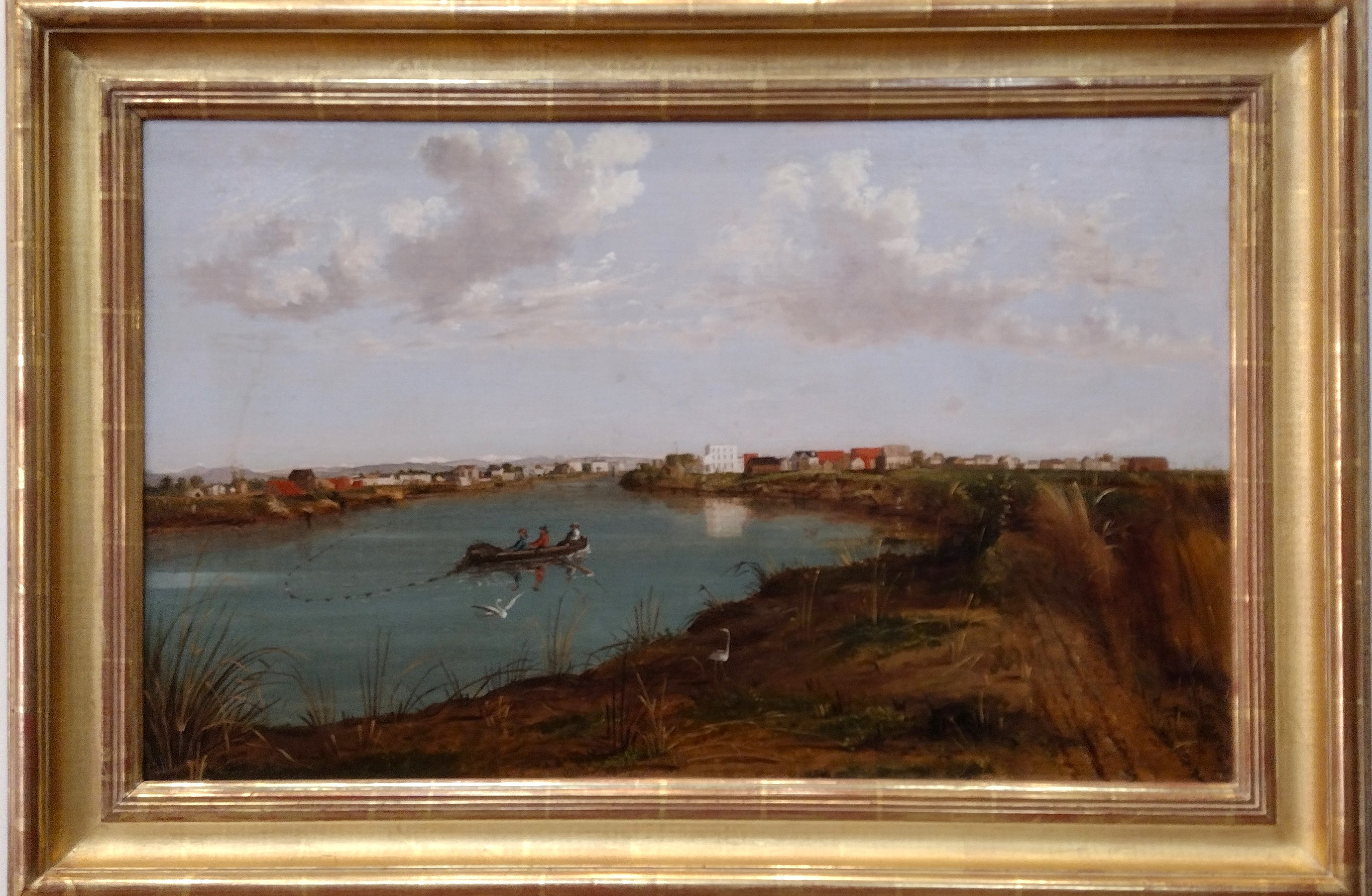 Three fishermen in a rowboat and two egrets are in the foreground, while small buildings line the channel behind them. Stockton was the jumping-off point for the southern mines of the Mother Lode. I am guessing that the large white building is the hotel. And isn’t Albertus Del Orient Browere an impressive name!