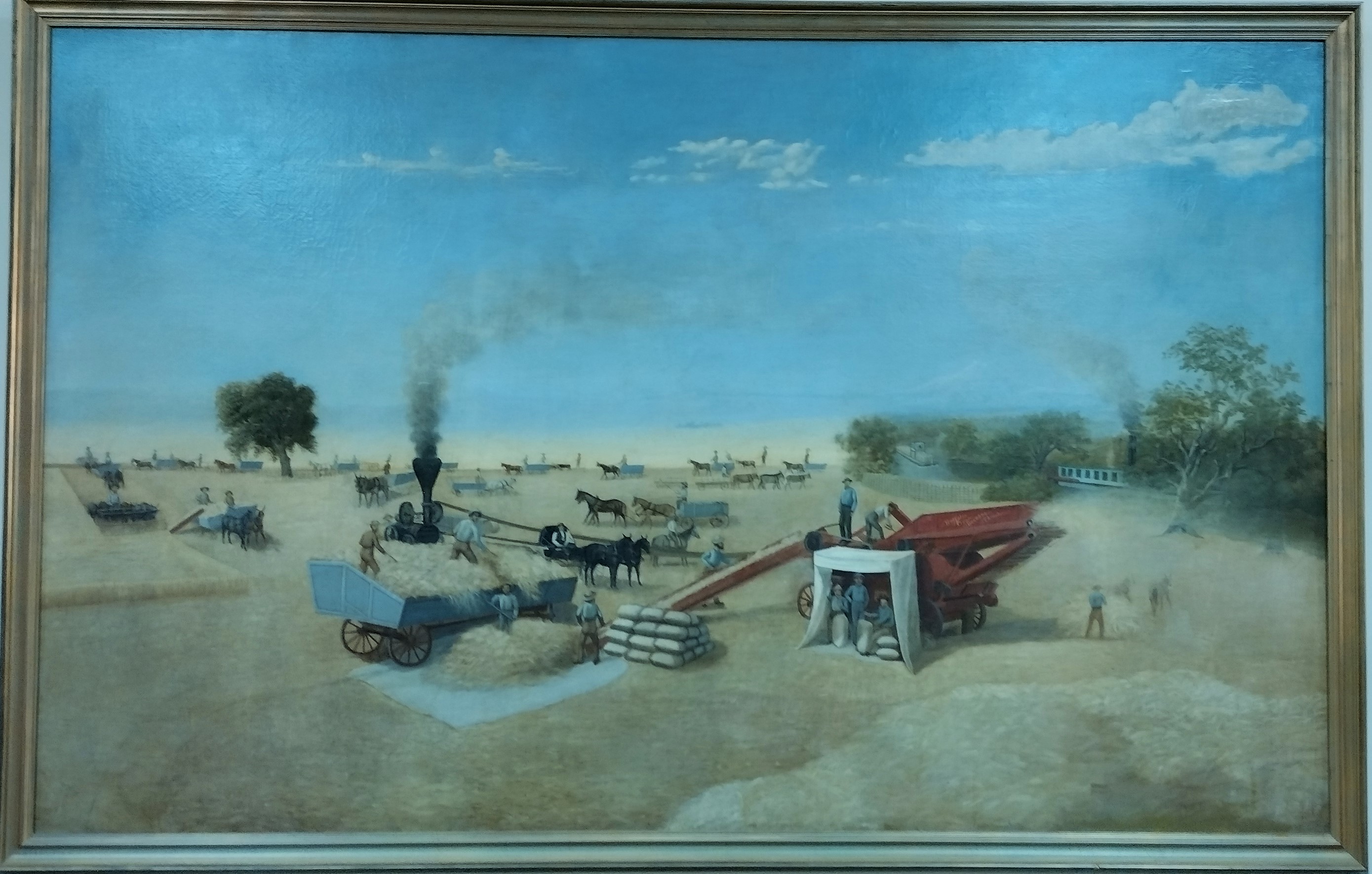 This painting (1875-1876) depicts a scene on the ranch of Dr. Hugh J. Glenn, for whom Glenn County is named. Dr. Glenn’s holding were huge, 55,000 acres. He had 6000 acres dedicated to growing wheat, earning him the nickname of the “Wheat King of California.” He was also prominent in politics. In the painting you can see the Sacramento River and two steamboats on the right, and faintly in the distance, Mt. Shasta. What looks like a locomotive is a steam engine for driving the thresher. I like the little tent, giving just three men a bit of shade in the hot sunshine. The man in the carriage may be Dr. Glenn himself.