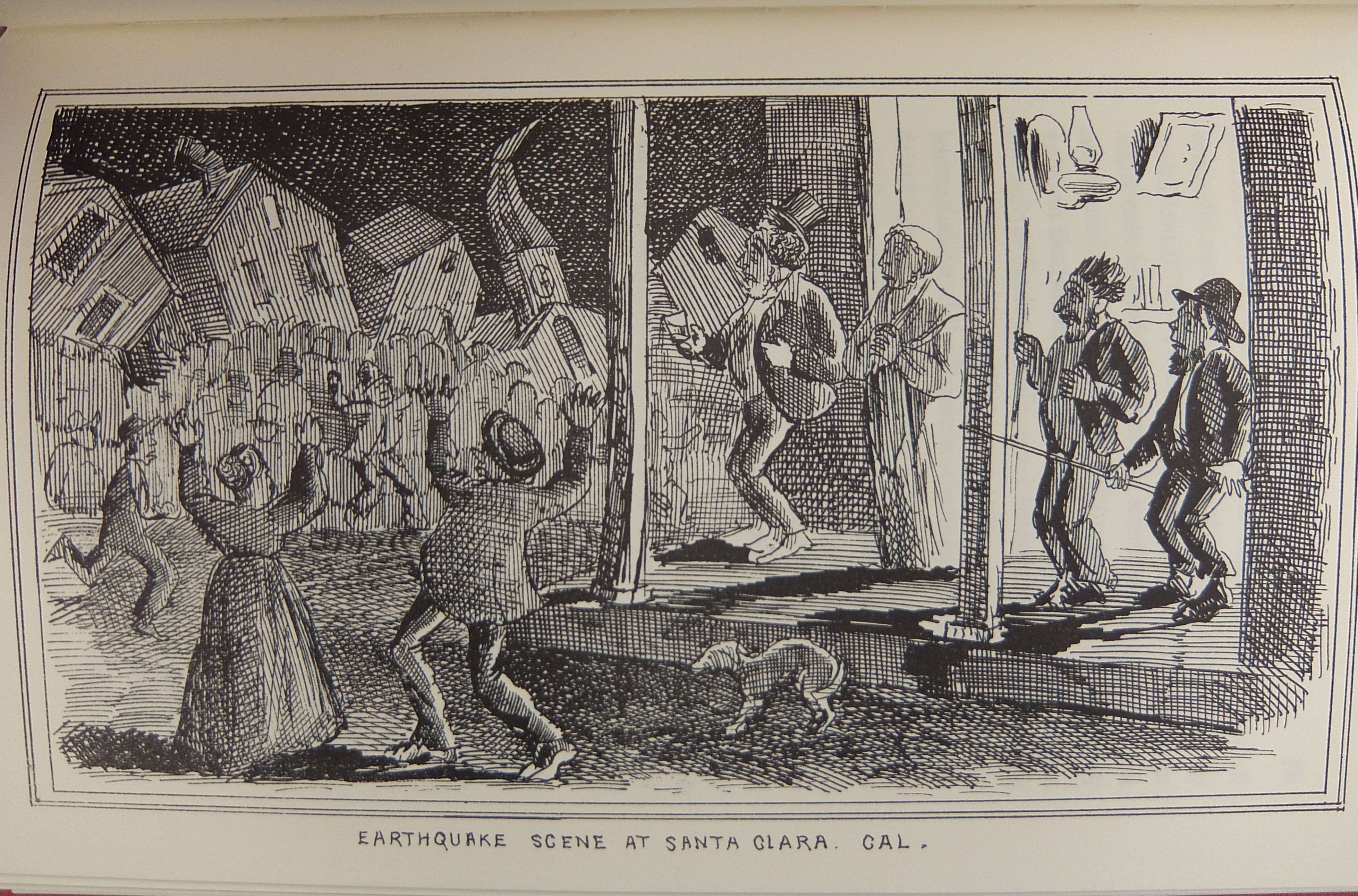 I now concluded to go to Santa Clara and canvass that town, before delivering my pictures in San José. Eight o’clock in the evening found me seated in the ladies’ parlor at the hotel, conversing with the landlord concerning the severe shock of earthquake we had two weeks previous.