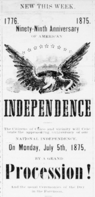 Our celebrations of Independence Day are skimpy compared to the way they enjoyed the Fourth in Chico in 1875. It was a full day of celebration, as promoted in the Chico Record on July 3rd. (The celebration took place of the 5th, since the 4th fell on a Sunday. Many of the days activities would be considered inappropriate for the Sabbath.)