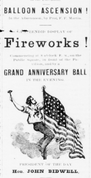 “The ceremonies at the Pavilion, under the direction of the President of the Day, Hon. John Bidwell, who seemed to be as happy as the occasion required, passed off with enthusiasm,” reported the Chico Record. These ceremonies consisted of songs by a choir, prayer, the reading of the Declaration of Independence, a patriotic poem, an oration by E.J. Lewis of Tehama, and more music. “At the conclusion of these exercises, the vast audience, which filled the Pavilion and over-flowed into the square and streets surrounding the building, were dismissed to be “free and independent” as of right they ought to be.”