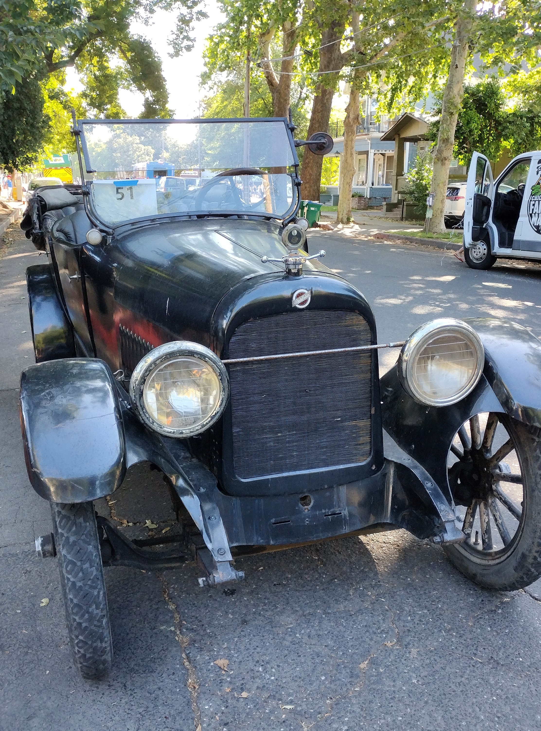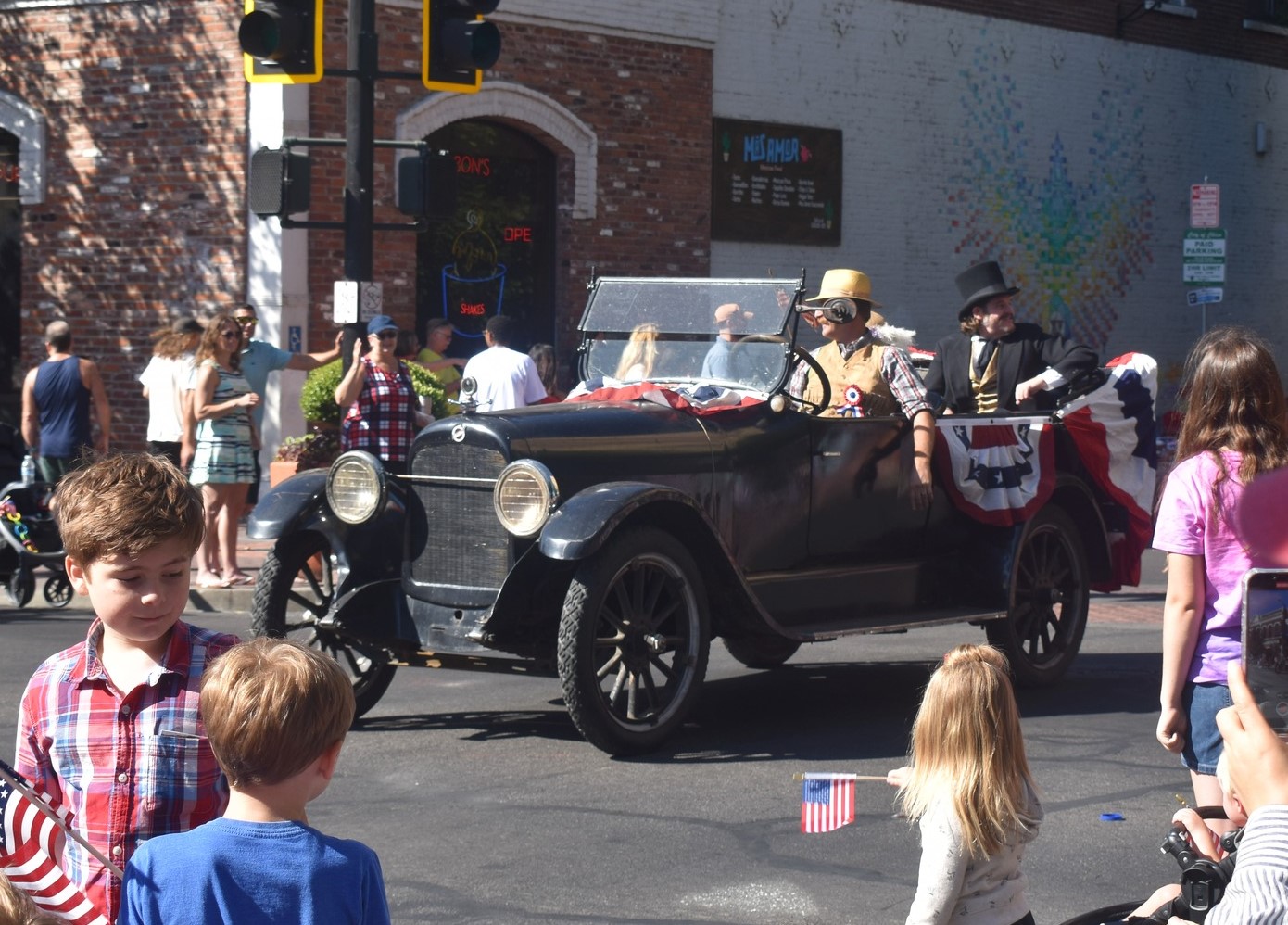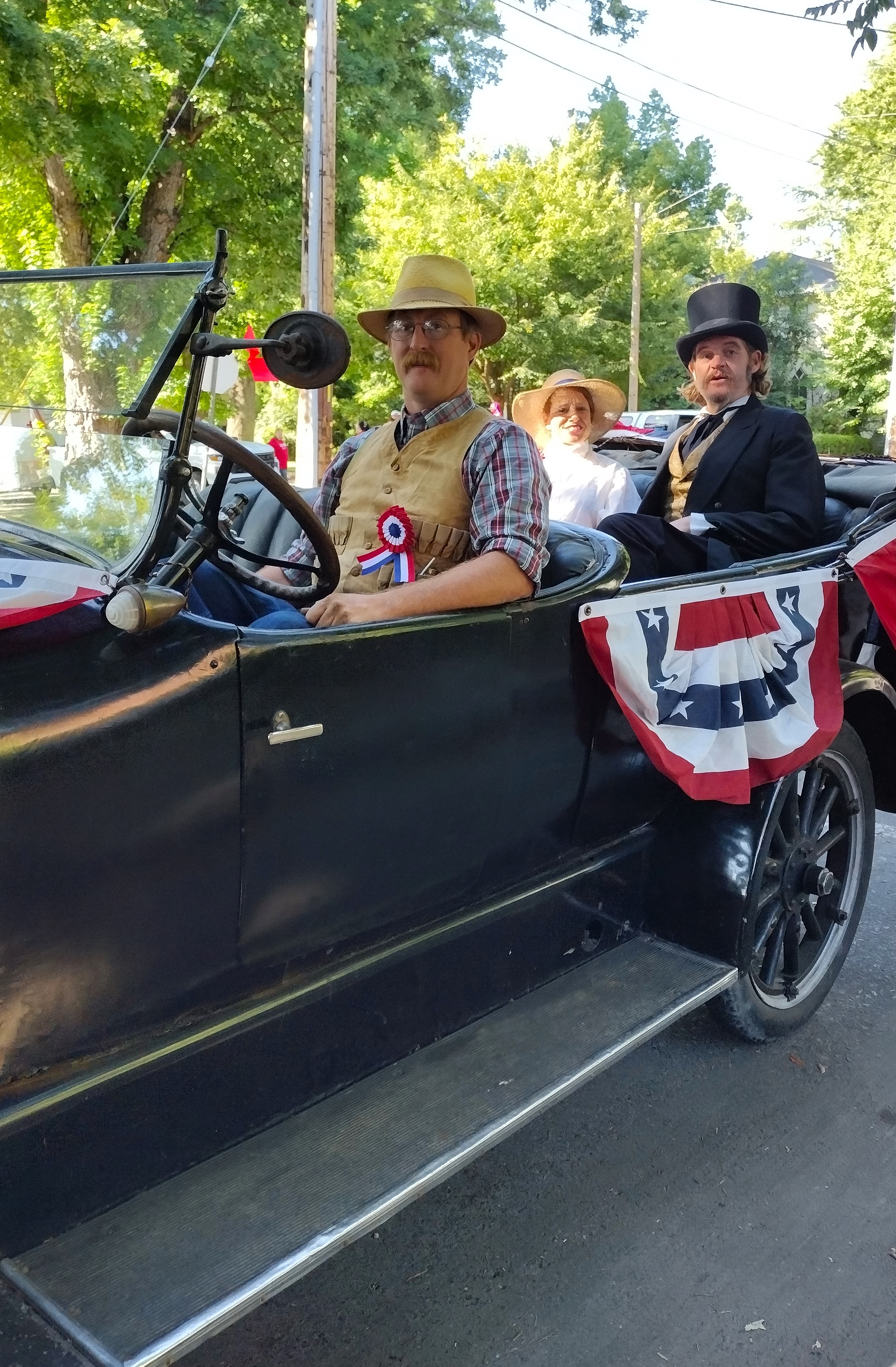 The Bidwell Mansion Association and friends gathered in costume to celebrate the 4th at the downtown Chico 4th of July Parade. “John and Annie” were given a classy ride in a beautiful 1920 Studebaker sedan generously provided by Jen and Ethan from Placerville. The rest of us walked.