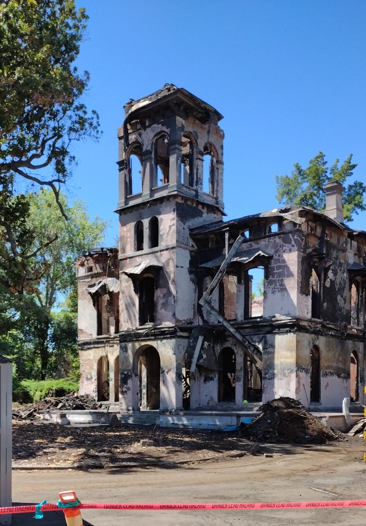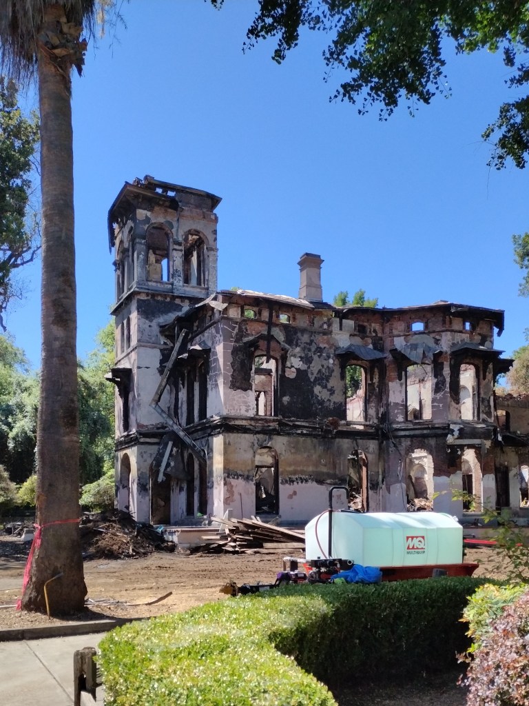 Crews have been at work cleaning up the exterior debris from the fire at Bidwell Mansion. With the scaffolding gone and the collapsed veranda cleared away, you can get a better look at the ruined structure. It’s a heart-breaking sight.
