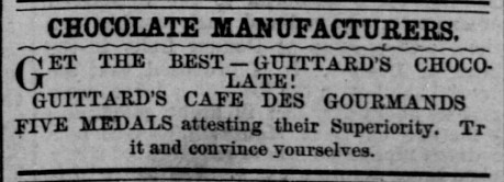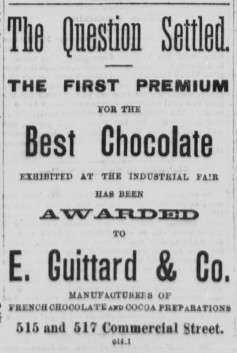 Etienne Guittard founded his business in San Francisco in 1868. He was born in Tournus, France in 1838 and came to California to seek his fortune, probably sometime in the early 1860s. (I can’t find a date anywhere.) He brought with him chocolate from his uncle’s factory to trade for mining supplies, and for three years prospected for gold in the Sierras. He realized that the chocolate that he had brought with him was every bit as desirable as gold, and so returned to France to acquire the knowledge and equipment he needed to go into the chocolate-making business in San Francisco.