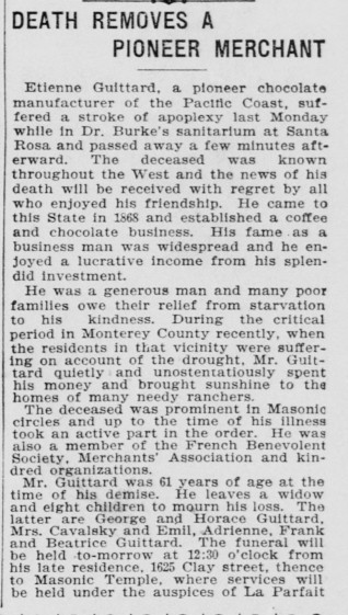 The business was a great success, and for 31 years Etienne Guittard led his growing company. He died at the age of 61 in 1899, passing the company on to his son Horace C. Guittard. Today Gary Guittard is CEO of the Guittard Chocolate Company, the oldest continuously family-owned chocolate company in the United States.