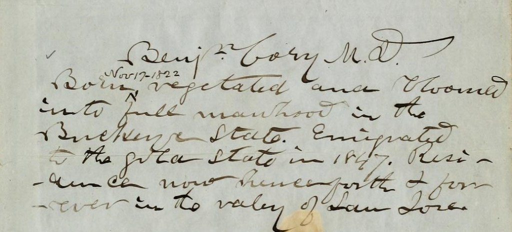 Benj’n Cory M.D. Born Nov. 17, 1822 vegetated and bloomed into full manhood in the Buckeye State. Emigrated to the golden state in 1847. Residence now henceforth and forever in the valey of San Jose.
