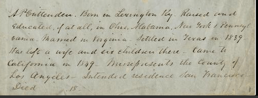 A.P.Crittenden. Born in Lexington Ky. Raised and educated, if at all, in Ohio, Alabama, New York & Pennsylvania. Married in Virginia. Settled in Texas in 1839. Has left a wife and six children there. Came to California in 1849. Misrepresents the County of Los Angeles. Intended residence San Francisco. Died 18-