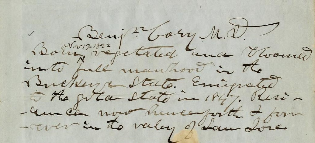 Benj’n Cory M.D. Born Nov. 17, 1822 vegetated and bloomed into full manhood in the Buckeye State. Emigrated to the golden state in 1847. Residence now henceforth and forever in the valey of San Jose.