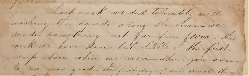 Last week we did tolerably well washing the sands along the river – we made something not far from $1000 – This week we have done but little – The first camp above where we were when you came to us, was good – the first day of our arrival there we took out not less than 300 dollars. – but the place soon became exhausted it being small, and we have not been able to find as good a one since – In fact if Mr. McCall had not arrived I should have sent an express to you yesterday. We are not making over $50 per day with all our Indians – and if we do not find a good place in one or two days at most, I want to go down either to Yuba or the American Fork.