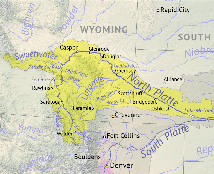 The Sweetwater rises at the southern end of the Wind River Mountain Range and flows almost due east to join the North Platte River near Independence Rock. It made an ideal trail for westering pioneers as it skirted the dramatic peaks of the Wind River Range.