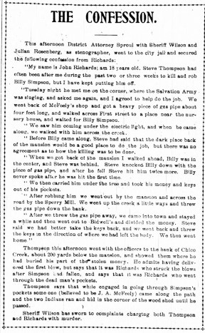 My name is John Richards; I am eighteen years old. Steve Thompson had often been after me during the past two or three weeks to kill and rob Billy Simpson, but I have kept putting him off.