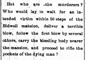At 6:30 a.m., just as it was getting light, he came upon the body of a man lying by the driveway, his head battered and bloody. As reported by the Chico Record, “A glance was sufficient to tell Peterson that an awful crime had been committed, for the upturned face of the body was covered with blood, the features disfigured and the head resting in a pool of blood.”